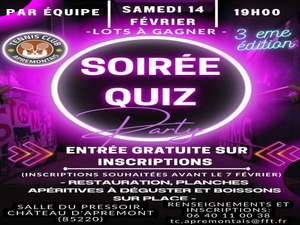 Le Tennis Club Apremontais organise une soirée Quiz le samedi 14 février 2026 à la salle du Pressoir.