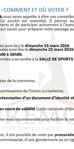 Le 1er tour des élections municipales aura lieu le dimanche 15 mars 2026. Le bureau de vote sera ouvert de 8h00 à 18h00
